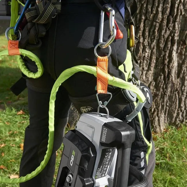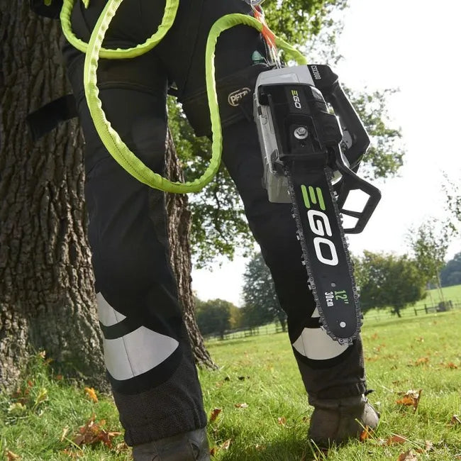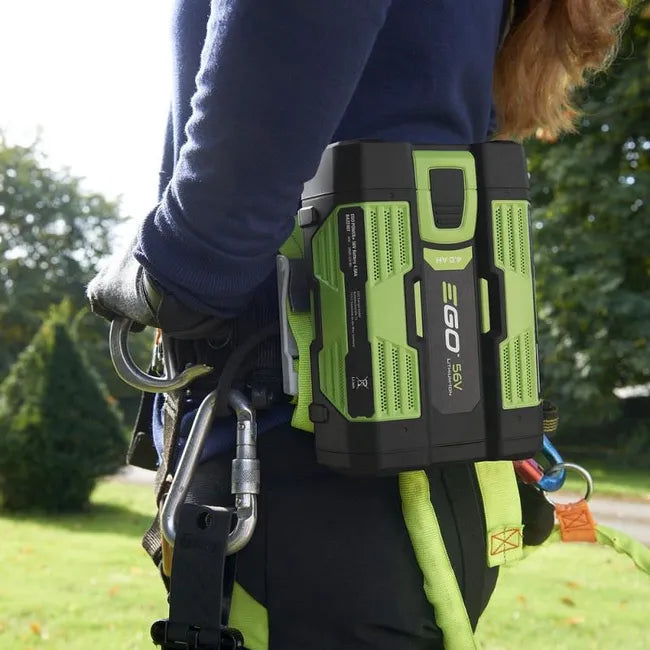 Cette tronçonneuse professionnelle compacte est équipée d'une batterie EGO 56 volts 4Ampères heure, qui sera logée dans l'harnais porte batterie fourni, lui-mme fixé à la ceinture de l'utilisateur : le travail est plus confortable avec un poids de machine allégé.
