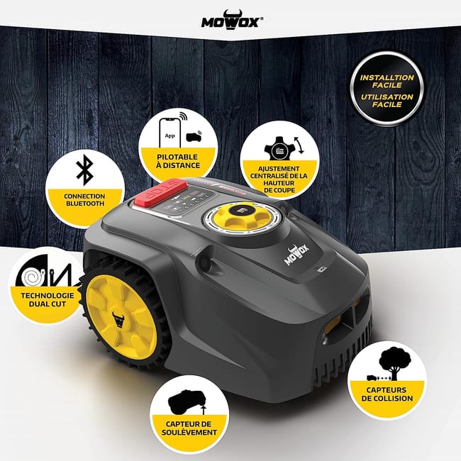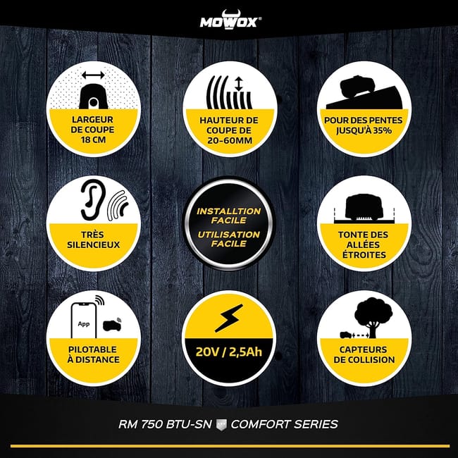 Robot tondeuse 18cm, 28V/2,5 Ah, capot plastique ASA, résiste à l'eau, pour des surfaces jusqu'à 750m², pentes max. 35%, capteurs ultrasons, Bluetooth / application Smartphone, réglage centralisé de la hauteur de coupe, mulching, incl. station de charge, 150 m de câble périphérique, 190 cavaliers, 4 vis de fixation. Protection anti-vol, capteurs de pluie, capteurs d'obstacles, de soulèvements, de renversement