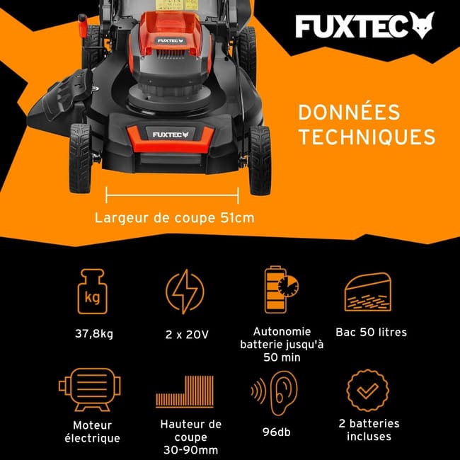Tondeuse gazon batterie autotractée 40V (2X20V) - FUXTEC FX-E2RM51 - 51cm mulching ejection latérale 2 batteries Li-Ion 4Ah, double chargeur, bac 50L