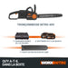 La tronçonneuse WORX WG385E est conçue pour des coupes rapides et efficaces, même dans du bois dur, grâce à sa chaîne à grande vitesse. Son système de tension automatique assure une tension optimale de la chaîne, tandis que la lubrification automatique maintient une performance fluide et continue. Un indicateur de niveau d'huile intégré vous permet de surveiller facilement l'état de la lubrification. Équipé d'un moteur Brushless innovant, il offre une performance comparable à celle des modèles thermiques tout en prolongeant la durée de fonctionnement et en garantissant une durée de vie supérieure à celle des tronçonneuses traditionnelles. Pour garantir votre sécurité, la tronçonneuse est dotée d'un frein de chaîne à arrêt rapide. Il est essentiel de porter des gants, des lunettes et un masque de protection pour éviter les débris et poussières de bois pendant l'utilisation. Toujours prête à l'emploi, la tronçonneuse WORX dispose d'un indicateur de niveau de charge sur la batterie. De plus, son chargeur double permet de recharger deux batteries simultanément, optimisant ainsi votre temps de préparation et vous permettant de rester productif. La batterie Powershare est interchangeable avec tous les outils WORX de la gamme 20V, 40V, 80V MAX. Profitez également d'une garantie de 5 ans, comprenant 2 ans constructeur et une extension de 3 ans sous condition d'enregistrement de votre outil dans un délai d'un mois après la date d'achat. Inscription sur le site eu.worx