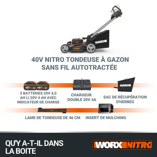 Tondeuse à gazon autotractée 2*20V WORX NITRO - WG749E (2 batteries 4Ah)
