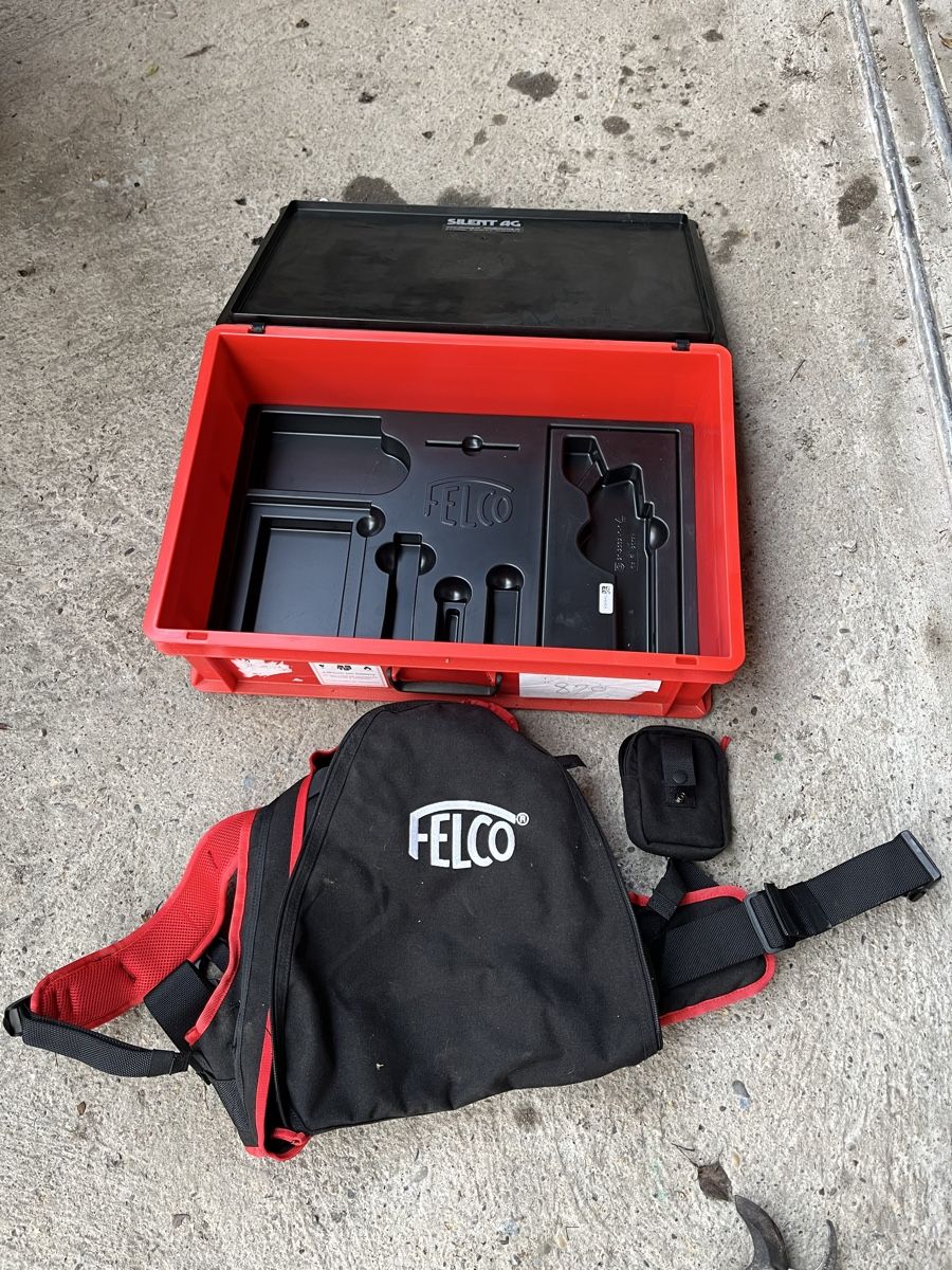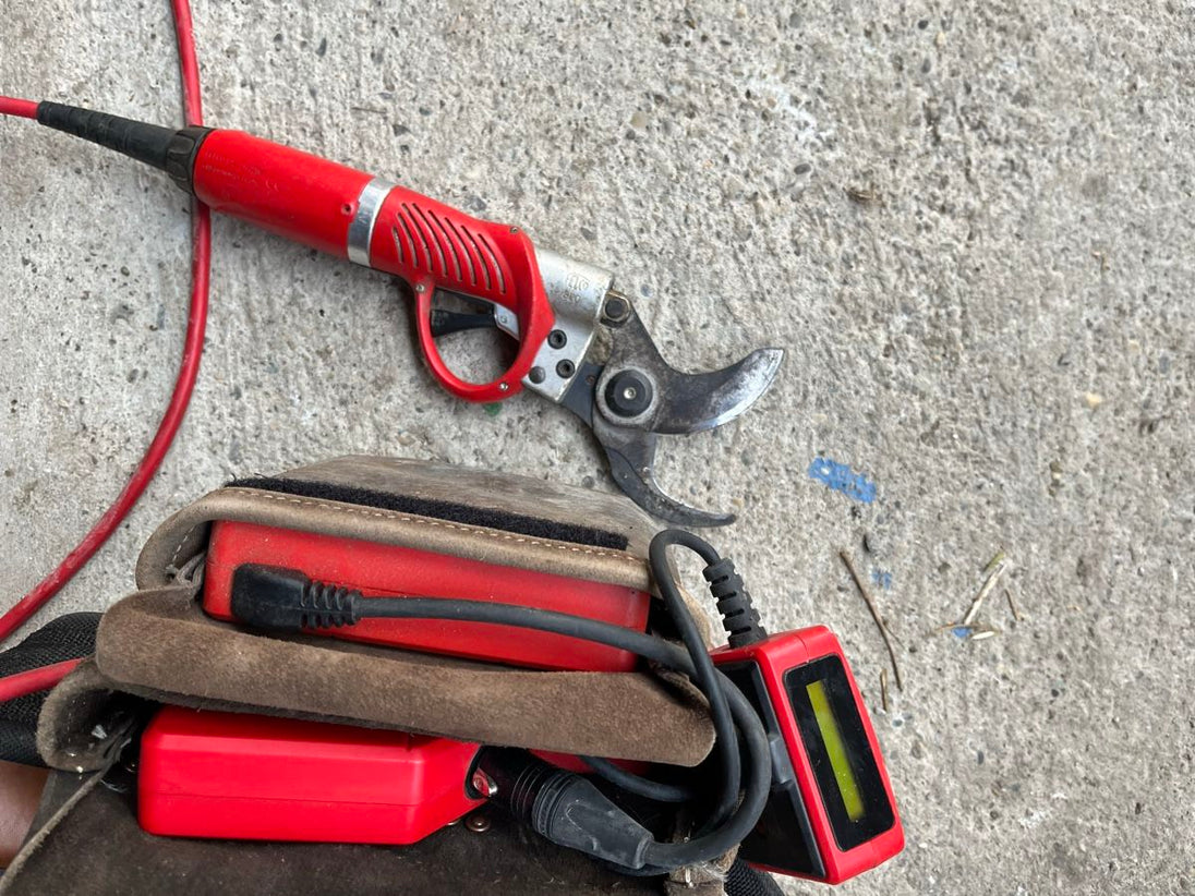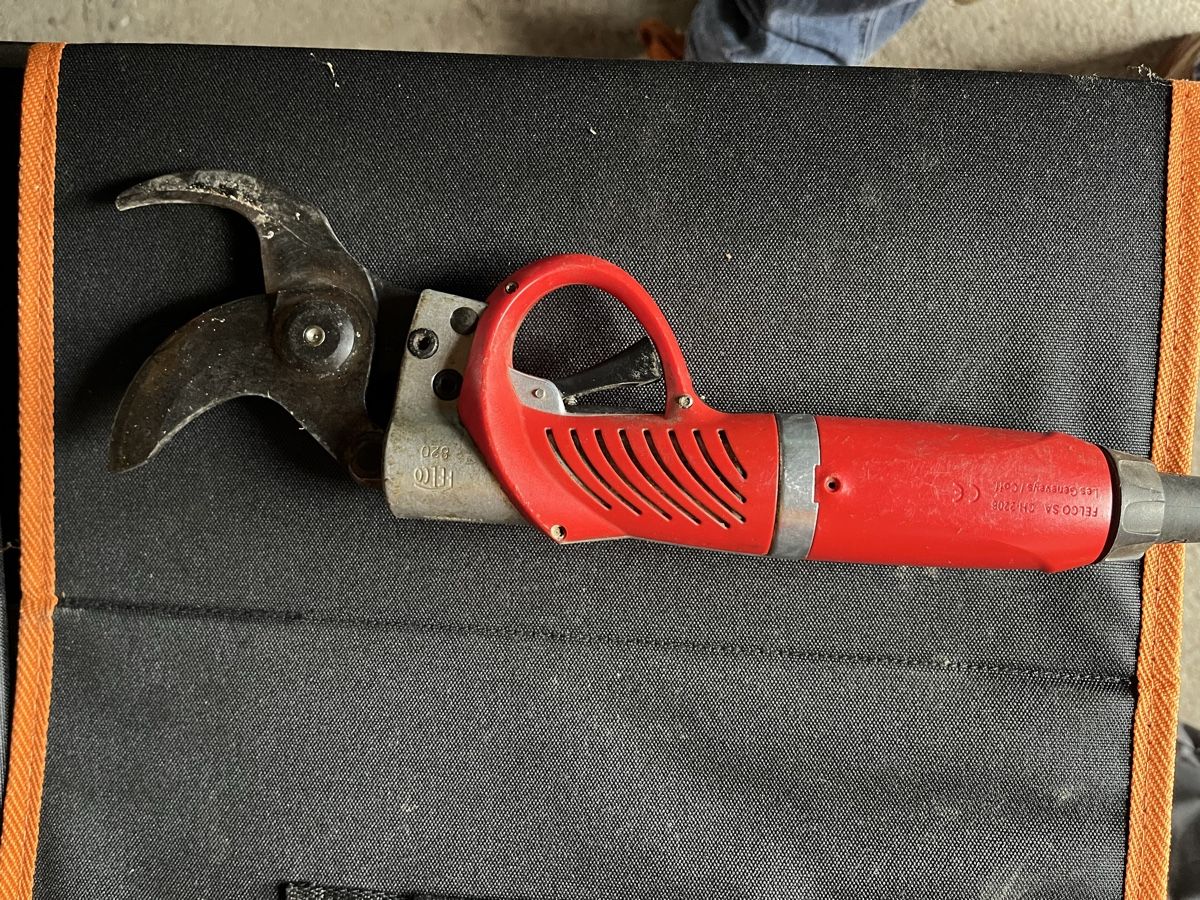 Tout juste sorti de service. Sécateur électrique Felco 820 pour arbres et vignes, diamètre de coupe de 45 cm, 2 ouvertures de lame (réglables par double clic), puissant et très longue durée de vie. Livré avec sac à dos, batterie, étui de ceinture, mallette, outil d'affûtage et graisse. Très peu utilisé. Le meilleur sécateur électrique pour un usage professionnel grâce à son grand diamètre de coupe et sa longue durée de vie.