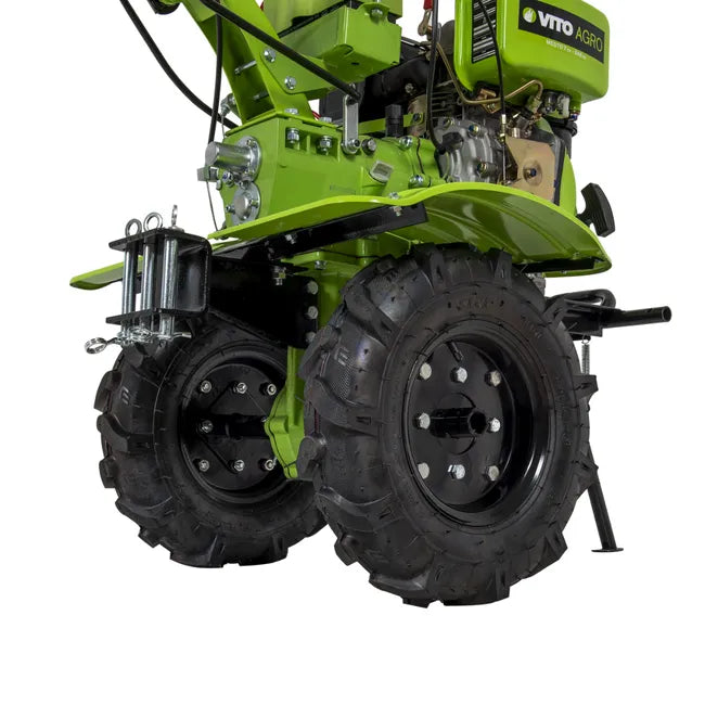 Motoculteur thermique polyvalent diesel 246 cm3 VITO AGRO 7CV avec transmission directe 5200W. Livré avec fraises et butteur pour labourer le sol, le décompacter et l'aérer. Cette machine est parfaite pour travailler le sol pour l'agriculture et le maraîchage. Elle permet de faire la mise en culture des sols et l'entretien du jardin potager ou maraîcher. Contient : Fraises et butteur