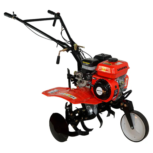 Motobineuse Agile et puissant Sakawa avec roue avant pour une plus grande maniabilité. Vous pouvez équiper votre moto avec des accessoires pour le rendre plus complet.