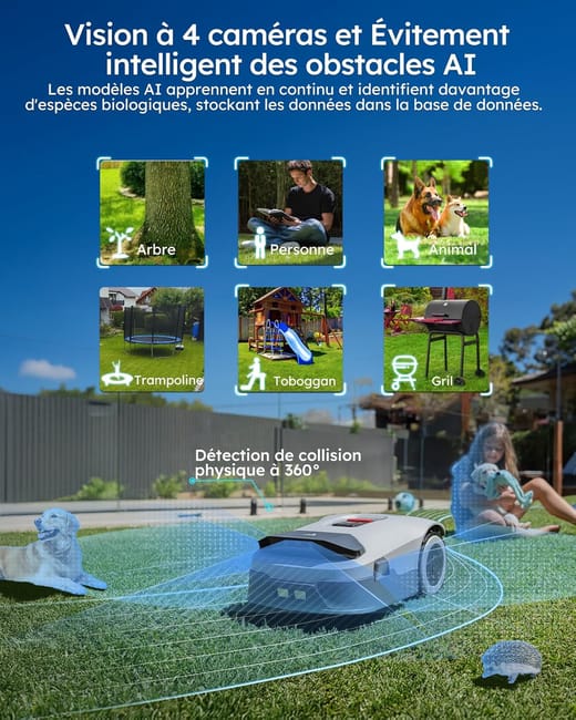 【Évitement d'Obstacles Intelligent】La caméra Genie, avec son champ de vision de 300° et ses algorithmes d'intelligence artificielle intégrés, détecte une large gamme d'objets courants dans le jardin, assurant ainsi un évitement d'obstacles renforcé et une sécurité accrue. Grâce à une détection rapide et précise des situations dangereuses, elle maintient une distance de sécurité vis-à-vis des animaux, offrant ainsi une protection optimale et une capacité d'évitement encore plus robuste.