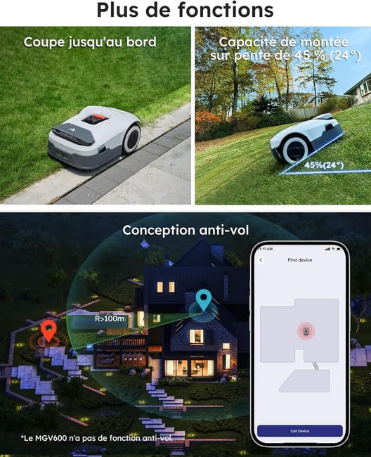 【Mode de Gestion Intelligent】Grâce à l'application mobile, vous pouvez contrôler et surveiller à distance l'entretien de votre pelouse avec votre tondeuse robot. En activant le mode de gestion intelligent, votre robot tondeuse sans fil ajuste automatiquement les horaires de tonte en fonction de la taille de votre pelouse, des variations saisonnières, de votre localisation, des conditions météorologiques et de l'heure. Cette fonctionnalité vous permet de prendre soin de votre jardin de manière plus précise et personnalisée.