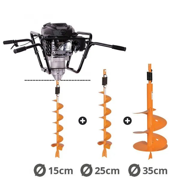 Les 2 guidons permettent de travailler à une ou deux personnes suivant la difficulté et les contraintes du terrain. 5 vrilles sont disponibles en accessoire pour percer des trous d'un diamètre de 10 à 35 cm.