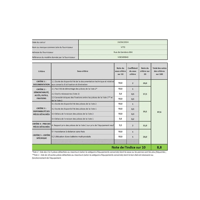 | Période de disponibilité des pièces détachées après le dernier achat de la dernière unité vendue (en années) | 2 |