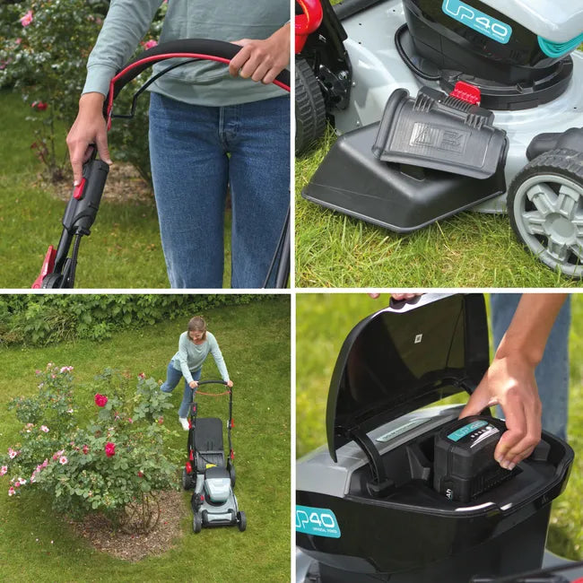 Ce kit comprend une tondeuse 46 cm, une batterie 40V 5Ah et un chargeur standard UP40. La meilleure concurrence de la tondeuse thermique, les avantages de la batterie en plus. Jusqu'à 550 m² d'autonomie avec une seule charge de batterie pour une tonte régulière. La tondeuse 46 cm sans fil à batterie UP40 allie puissance, autonomie, facilité d'utilisation, liberté de mouvement et n'émet aucune émission polluante pendant l'utilisation. Sa largeur de coupe de 46 cm et l'ajustement centralisé de la hauteur de coupe (7 positions, de 2.5 cm à 7.5 cm) vous permettent une tonte performante qui s'adapte à tous les gazons. Sans fil, elle offre une liberté de mouvement maximale : elle contourne les obstacles avec aisance et fluidité et couvre 100% des zones les plus reculées. La tondeuse est équipée de la fonction traction pour vous assurer un travail sans effort même dans les pentes. Grand confort de prise en main avec le guidon ergonomique, ajustable en hauteur et recouvert d'une mousse protectrice. Démarrage facile par simple enclenchement du bouton start. La tondeuse est dotée d'un carter en acier résistant aux chocs pour assurer une durabilité optimale de la machine.Son moteur ""Brushless"", sans charbon, ajuste automatiquement le niveau de puissance en fonction des exigences du type de gazon à couper. Elle se range facilement et est peu encombrante, grâce à son guidon repliable et son bac semi-rigide. Adaptée à une utilisation dans les zones sensibles au bruit à proximité d'habitations. La plateforme UP40 : une seule batterie pour tailler, tondre, débroussailler, tronçonner, élaguer et souffler... votre meilleur allié pour entretenir votre jardin en toute simplicité. Pour une meilleure durabilité, il est conseillé de conserver votre batterie à une température allant de 4° à 24° degrés et un taux de charge compris entre 25% et 50%. Pensez à la planète, n'oubliez pas de recycler vos batteries. Sterwins des produits de qualité : Machine Garantie 5 ans, chargeur et batterie Garantie 3 ans, durée de vie testée, et de nombreuses pièces détachées disponibles.