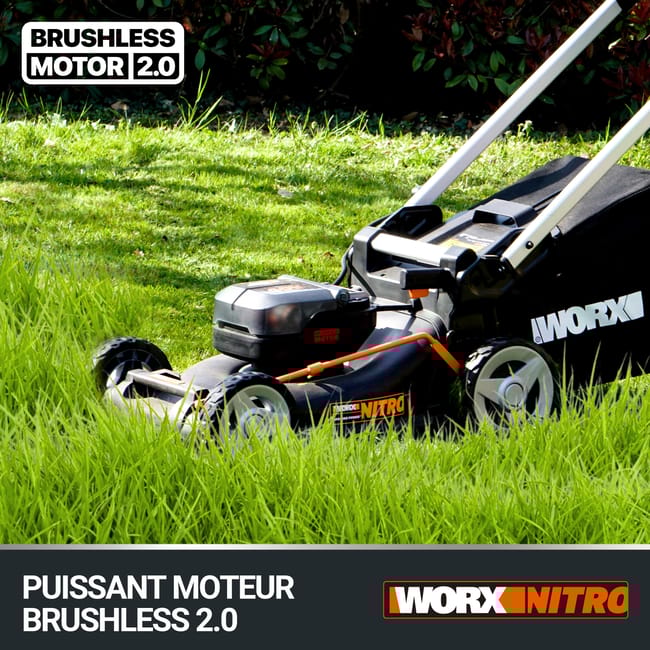 La tondeuse WORX WG749E est dôtée d'un moteur brushless pour une meilleure compacité, plus d'autonomie et plus de puissance, avec une fonction auto-propulsée avec vitesse variable. Elle est idéale pour les surfaces de tonte allant jusqu'à 500 m². La technologie IntellicutTM maintient un niveau de tonte constant automatiquement quelque soit la densité de la pelouse. Elle possède un sac de récupération ainsi qu'une fonction mulching. Elle détient un levier à 7 positions de hauteur de coupe ainsi qu'une poignée ajustable en hauteur pour un meilleur confort d'utilisation.