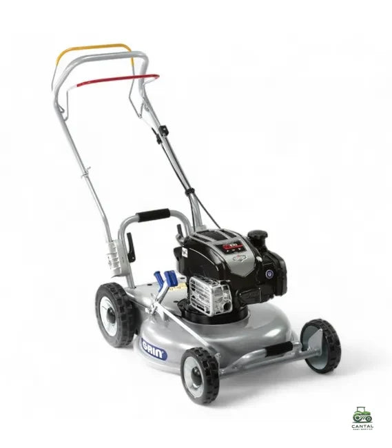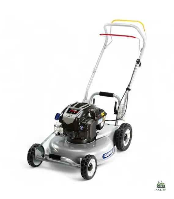 Cette tondeuse est équipée du système breveté GRIN "Tondre, Ne Plus Ramasser, Stop aux Déchets", permettant une tonte pulvérisante efficace sans avoir à ramasser les déchets d'herbe. La hauteur de coupe est réglable avec un levier unique, offrant 4 positions différentes pour s'adapter aux préférences de l'utilisateur et aux conditions de la pelouse.