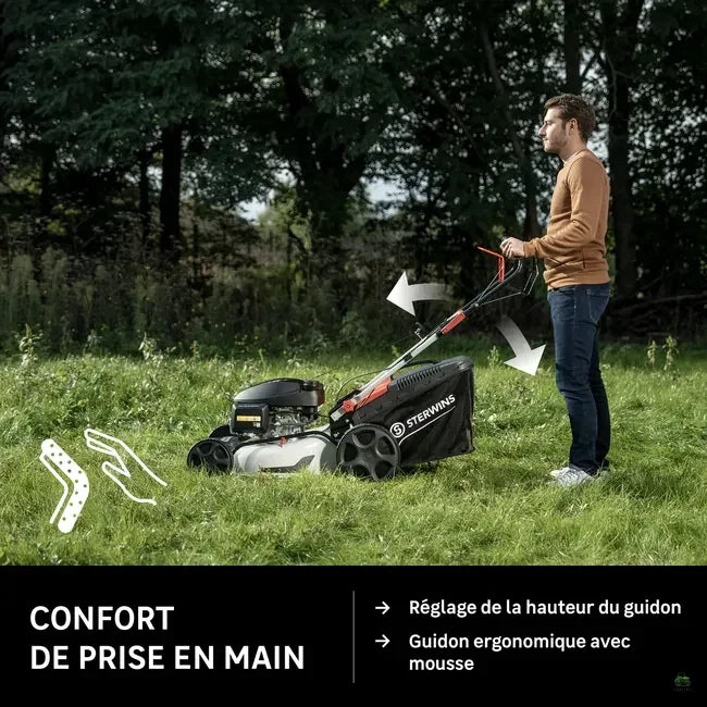 La tondeuse thermique 51 cm STERWINS, moteur HONDA, est idéale pour l'entretien des jardins allant jusqu'à 1500 m². Sa largeur de coupe de 51 cm et l'ajustement centralisé de la hauteur de coupe en 7 positions (de 2.5 cm à 7.5 cm) vous permettent une tonte performante qui s'adapte à tous les gazons. La tondeuse est équipée de la fonction traction pour vous assurer un travail sans effort même dans les pentes. Grand confort de prise en main avec le guidon ergonomique, ajustable en hauteur et recouvert d'une mousse protectrice. Fonction 3en1 pour tondre, mulcher et éjecter. Très grande contenance du bac de ramassage (60 L). Elle se range facilement et est peu encombrante, grâce à son guidon repliable et son bac semi-rigide. Sterwins des produits de qualité : Garantie 5 ans, durée de vie testée et de nombreuses pièces détachées disponibles.