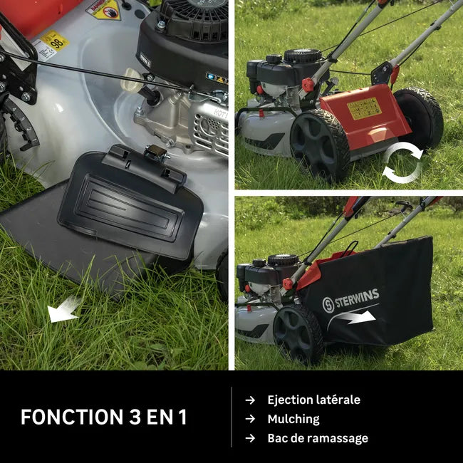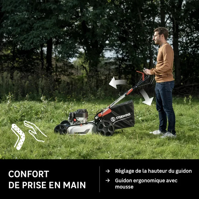 La tondeuse thermique 51 cm STERWINS est idéale pour l'entretien des jardins allant jusqu'à 1500 m². Sa largeur de coupe de 51 cm et l'ajustement centralisé de la hauteur de coupe en 7 positions (de 2.5 cm à 7.5 cm) vous permettent une tonte performante qui s'adapte à tous les gazons. La tondeuse est équipée de la fonction traction pour vous assurer un travail sans effort même dans les pentes. Grand confort de prise en main avec le guidon ergonomique, ajustable en hauteur et recouvert d'une mousse protectrice. Fonction 3en1 pour tondre, mulcher et éjecter. Très grande contenance du bac de ramassage (60 L). Elle se range facilement et est peu encombrante, grâce à son guidon repliable et son bac semi-rigide. Sterwins des produits de qualité : Garantie 5 ans, durée de vie testée et de nombreuses pièces détachées disponibles.